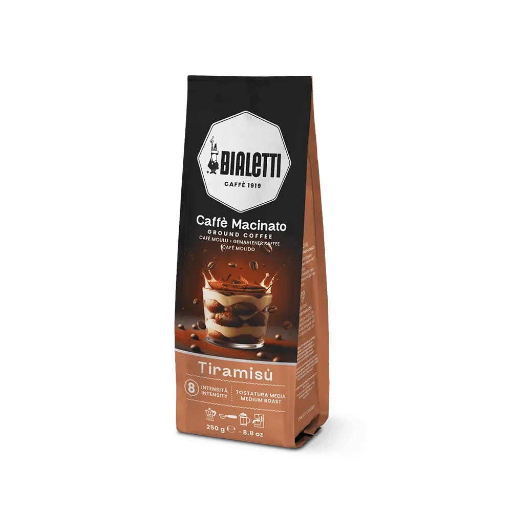 Cafea macinata Bialetti Gusto Tiramisu 250 g este o combinatie aromata intre espresso-ul italian si notele dulci specifice desertului tiramisu.