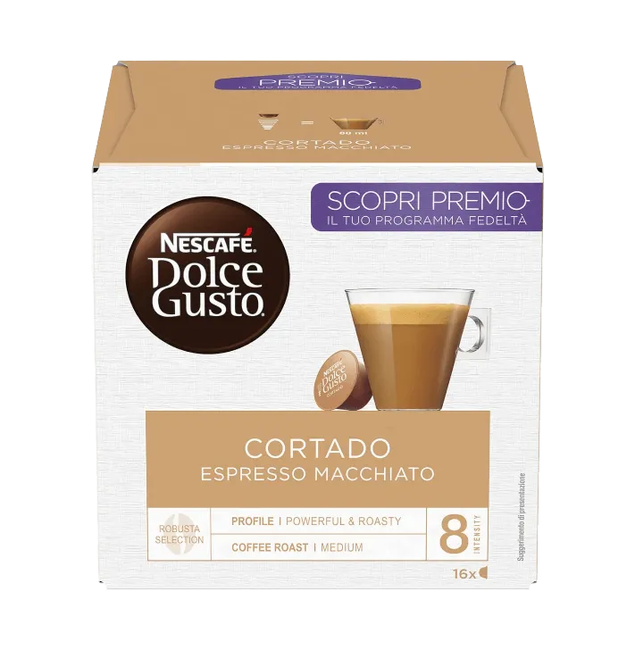 Capsule originale Nescafe Dolce Gusto Cortado Espresso Macchiato. Bautura echilibrata, cu espresso intens si o nota fina de lapte, ideala pentru o ceasca rapida si cremoasa.
